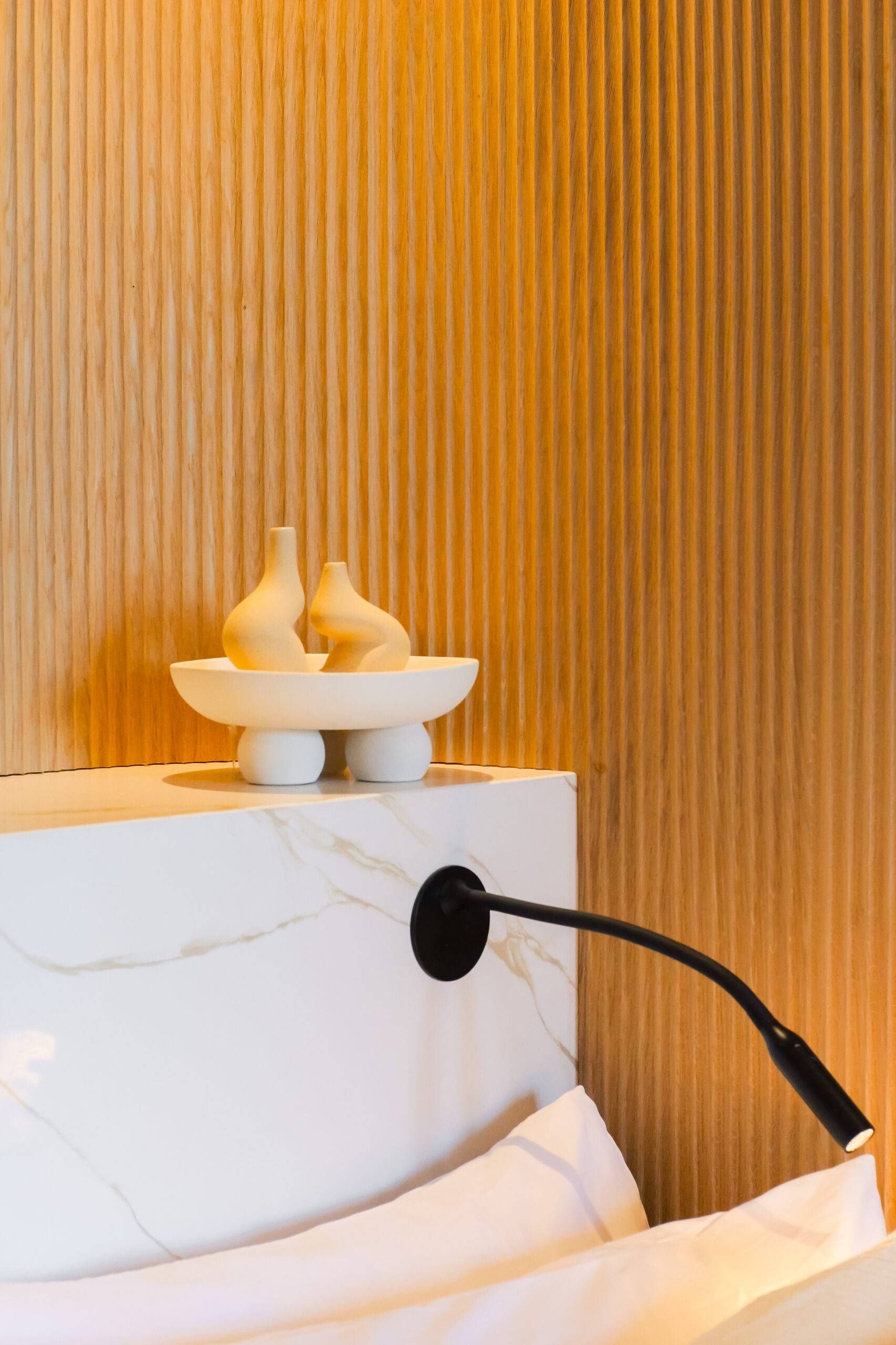 The open plan layout welcomes light across limewashed floors, warm oak detailing and marble accents, creating a space that feels both modern and tactile. The palette moves between beige, ivory and soft sand, layered to create warmth without weight. A private balcony overlooks the surrounding cityscape, offering a quiet vantage point above the streets below. It is a home defined by stillness and style, where simplicity finds richness in texture and depth in design.
